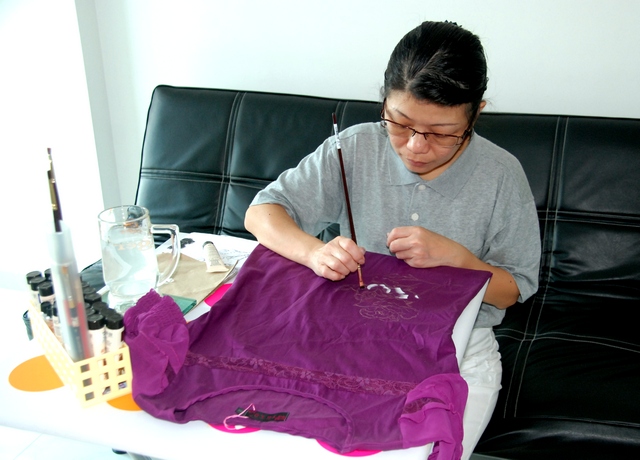 As the date of the 2013 Tzu Chu Singapore Chinese New Year Charity Bazaar drew near, Soh Chin had a thought, “I must think of a way that I can contribute to this worthy cause!” Realising that clothes were the most saleable item during the festive period, she decided that it would be a good medium on which to display her Chinese brush painting skills.